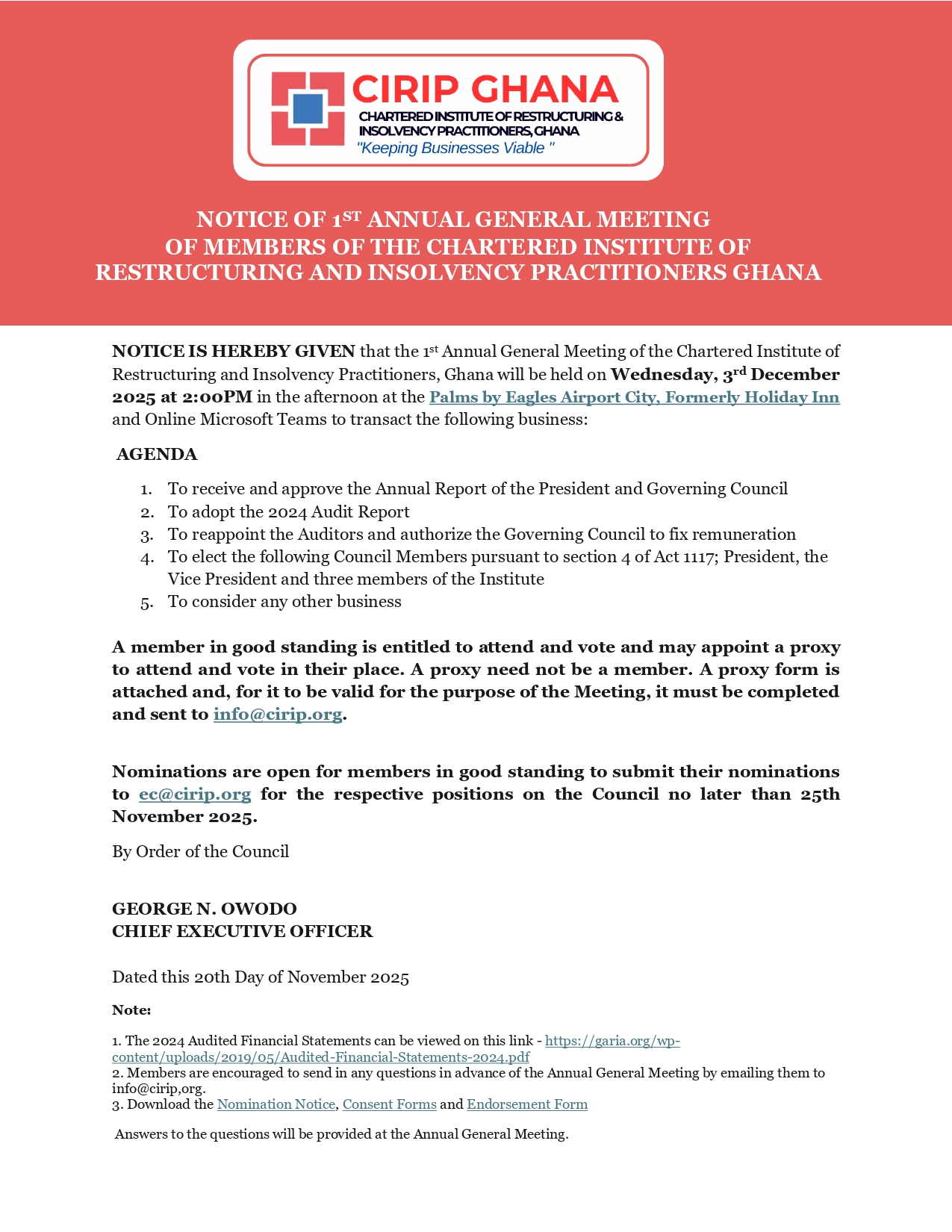 NOTICE IS HEREBY GIVEN that the 1st Annual General Meeting of the Chartered Institute of Restructuring and Insolvency Practitioners, Ghana will be held on Wednesday, 3rd December 2025 at 2:00PM in the afternoon at the Palms by Eagles Airport City, Formerly Holiday Inn and Online Microsoft Teams to transact the following business: